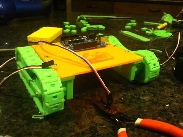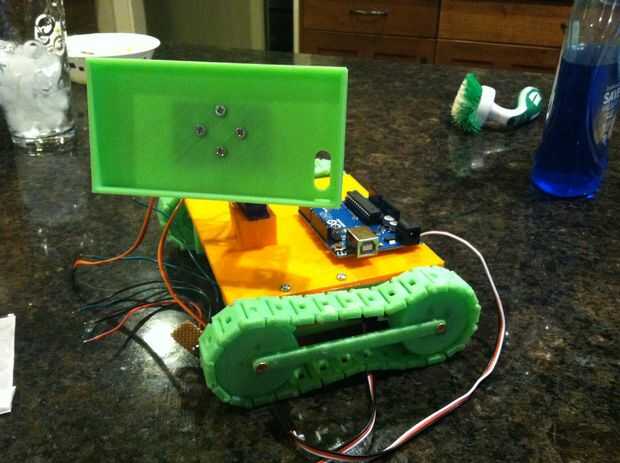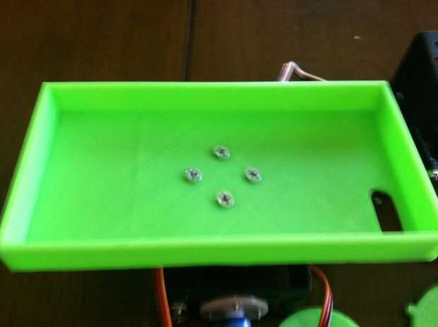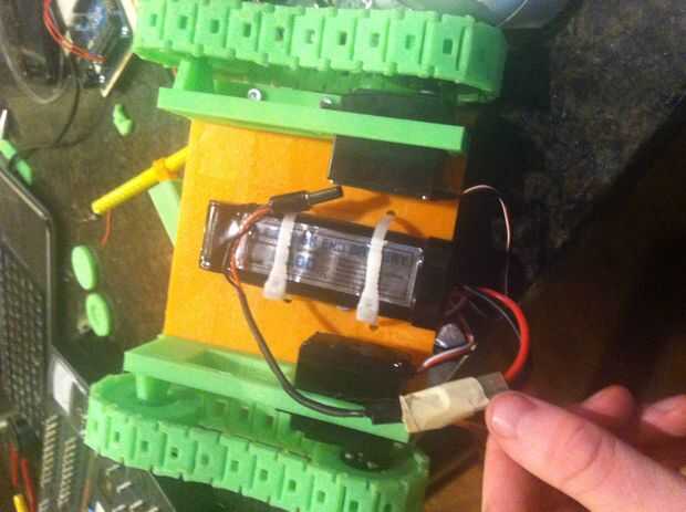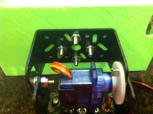 Perfore agujeros en la base para abrazaderas de plástico sujetar la batería a la parte inferior de la base. zip empate la masa en la parte inferior. Conectar el Arduino con los pernos. Después de Conecte los servos a la base usando pernos.