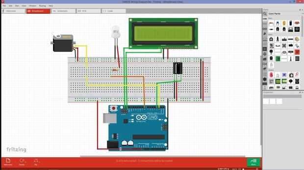 El diseño del tablero era engañosamente simple. Puesto que todo lo que realmente se conectó a fue la pantalla que tenía una mochila de I2C por lo que sólo necesitan 4 pines de los cuales dos fueron por el poder, el IR recibió que necesitó solamente tres pernos y 4 LEDs que necesitan 2 pernos y tres pernos del servo.