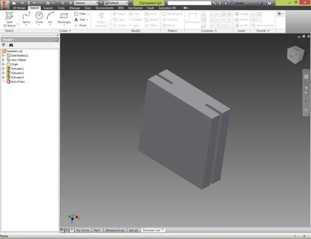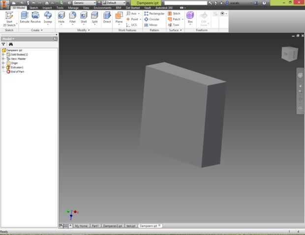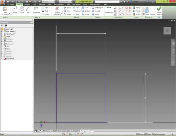 Tiempo de modelado 3D. Poner en marcha su programa de CAD de la opción y crear una pieza nueva. Recuerde que todos los modelos 3D comienzan con formas 2D. Crear un dibujo 2D y dibujar una forma base para el amortiguador. Basado en mis medidas, crea un cuadrado de 25mm como una forma de partida. Terminar el dibujo y elija la herramienta de "extraer". Esto hará que nuestro boceto 2D en un objeto dimensional 3. Sacar la forma 8mm.