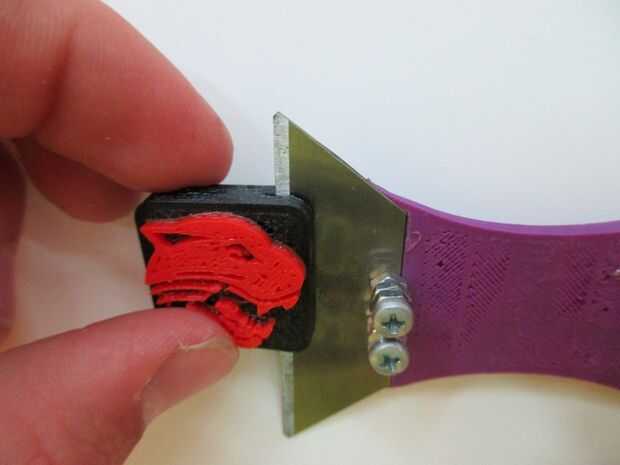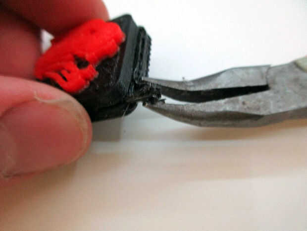Finalmente, se completa el amortiguador. Salte de la cama de impresión y retire el material de apoyo con alicates de punta. Sólo debe extraer. Para quitar el material de apoyo de las protuberancias de la cadena, deslice con cuidado una hoja de afeitar en la cavidad. Coloque el amortiguador entre las dos secuencias medias en la parte inferior de la raqueta y VOILA!