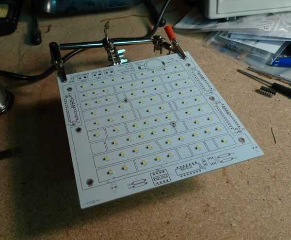 Fe de erratas de la PCB: La huella de la pila de botón (CR2032) tiene la polaridad invertida. Esto creó la necesidad para la modificación de la corte y puente (usando cable wire-wrap rojo) ve en las fotos del montaje final.