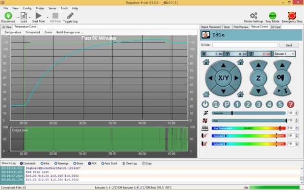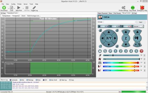 Queríamos saber cuánto mejor la cama climatizada está realizando con el nuevo aislamiento. Simplemente establecemos la temperatura a nuestra meta de 110° C ABS. La impresora a 15 minutos, por lo que establecemos una temperatura más alta y la temperatura mantiene aumento! Para nuestra impresora, usando la 10 mm manta gruesa de Aerogel, hemos estabilizado a una temperatura máxima apenas tímida de 115° C.