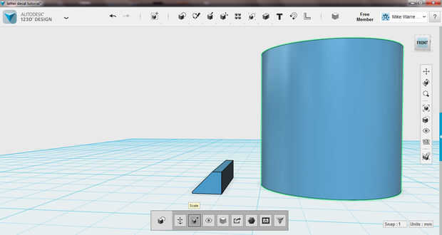 Haga clic en el cilindro, en la barra inferior haga clic en el icono de escala . Arrastre la flecha sobre el modelo de la escala hacia abajo. Vamos a usar el cilindro pequeño como una de las patas para bajo el modelo. Estas piernas permitirá a la aguja y el hilo pase a través y asegure el gráfico a su sombrero.