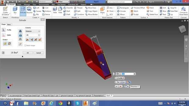 Cortar un agujero para el cable de carga del Iphone, dibujando un rectángulo en la parte inferior de la caja del teléfono y utilizar la función de extrusión (dirección 2) para retirar el material. A continuación, dibuja dos rectángulos más pequeños sobre el botón headphone jack y el poder, una vez más uso extrusión (dirección 2) para quitar el material dentro de los rectángulos dibujados.