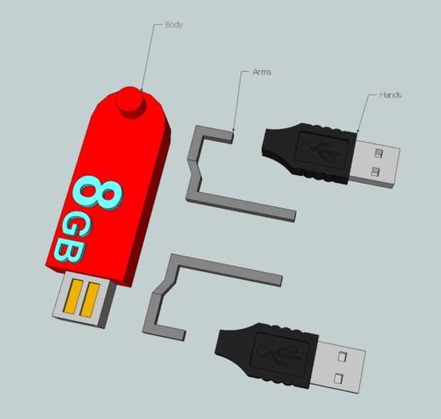 Impresión 2.) el "BodyAndArms" para la unidad FOB de 8 GB, cables USB y conectores de un tipo