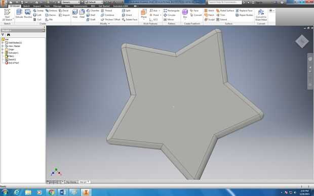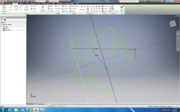 Con la herramienta de Pentágono, abra un Pentágono de cinco punto 5" a través de y 5" de largo. Luego desde el centro realizar un círculo 2" de diámetro. Luego conecte las líneas del centro de a círculo, las líneas rectas del Pentágono. Luego dibujar líneas desde los puntos al centro de las líneas que acaba de crear. A continuación, elimine todas las líneas que están en el exterior y dentro de las líneas apenas conectada a los puntos. Saca. 5" y filete de todas las esquinas y bordes por. 15".