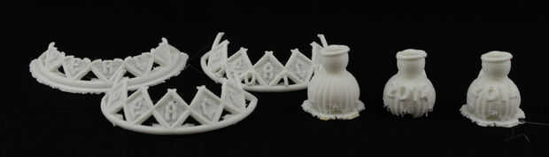 Hemos añadido más detalles después de que se resolvieron los principales elementos del diseño de Ángel. Éstos incluyeron una textura a las letras "La paz" en una parte inferior de la falda, la blusa y el año. La foto muestra impresiones de prueba de cada uno para revisar la calidad. El diseño es un proceso iterativo, pero la impresión 3D es aún más. Nos tomó cerca de 12 repeticiones para conseguirlo afilado con piedra en el aspecto y la calidad que queríamos.