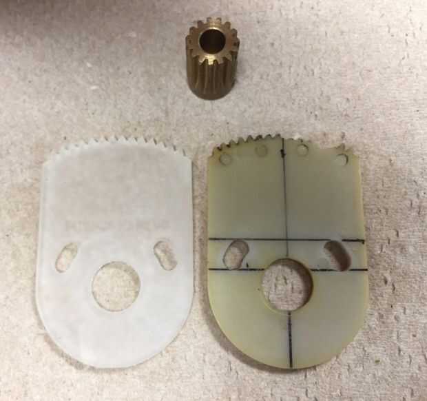 Mi primer 3D imprime la parte en forma 1 impresora 3D de un Formlab pero el material estándar es suave para el uso de engranajes. Se puede ver en la foto la parte 1 de forma clara un partido a la pieza original. Después imprimí las piezas en una Lulzbot Mini en ABS para ser más durable.