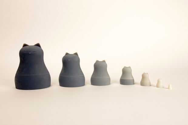 Las muñecas representan algún tipo de felinos estilizados. Realmente hubiera sido más fácil mantener la forma de la clásica muñeca rusa o de otra forma simple, pero la desviación de la simetría perfecta y para una zona más cóncava y agregando detalles hacen más de una experiencia de aprendizaje.