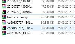 - Dentro de la carpeta DICOM ahora habrá uno o más. nii.gz archivos. Si está en duda sólo uso uno más grande. Le cambió el nombre a "brainscan.nii.gz" para que sea más fácil de encontrar y manejar.