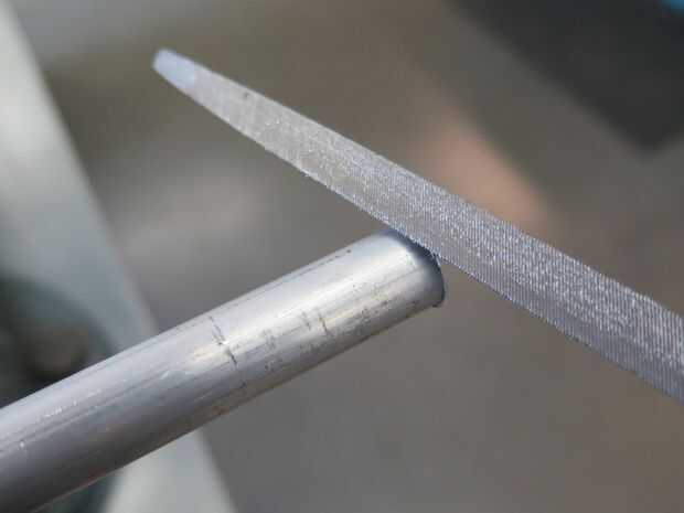 Para unir las Cañas, primero asegúrese de que se cortan en tiras de 5-6". Utiliza una sierra de metal frío para cortar mi varilla de aluminio y luego había archivado las fresas afiladas con una lima de mano del metal.