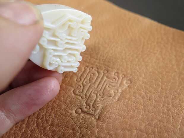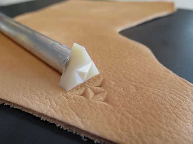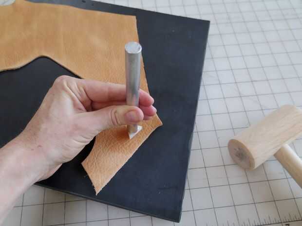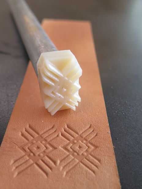 Cuando estés listo para estampar, coloque su sello sobre el cuero y sosténgalo firmemente (que encontré fue mejor hacia el centro de la barra metálica y descansar el talón de la mano en el tablero para un agarre firme). Llevará mazo y golpear firmemente el extremo de la varilla de metal. Un golpe firme funciona mejor. Más de una vez los riesgos que el sello de rebote fuera de lugar y crear una imagen doble.