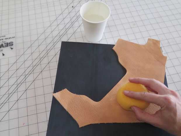 Ahora 'case' su piel mediante la aplicación de agua a ambos lados con una esponja. Que desea ser húmedo, no empapado. Piel demasiado seca será difícil estampilla, cuero demasiado mojada no celebrar así los patrones de estampado. Es mejor no utilizar un recipiente de metal para el agua, ya que puede causar la piel se decolore. Espere unos minutos hasta que su piel ha vuelto a su color original para comenzar a estampar.