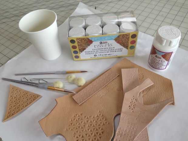 Usé cuero Eco-Flo de Tandy tinte para teñir mi piel y Shene raso Eco-Flo para sellarlo.