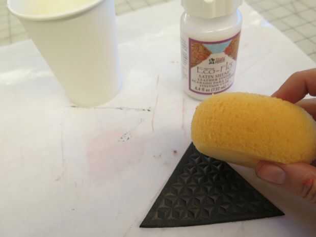 Después de que su cuero es teñido a su gusto, déjelo secar completamente antes de sellarla. Apliqué mi Shene Satén con una esponja ligeramente húmeda. Le di dos capas, dejarla secar en el medio.