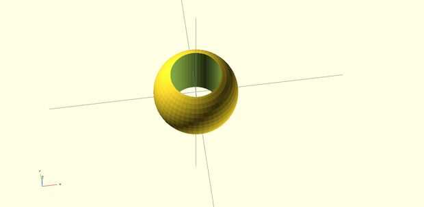 Para abrir el apetito, aquí está algo de código para dibujar una esfera con un agujero en él. Esta es la versión de OpenSCAD del programa Hola mundo que todo el mundo escribe al aprender un nuevo idioma. Al ejecutar esto, creará un archivo llamado HelloWorld.scad. Empezar a OpenSCAD y carga que archivo y verás una imagen como la anterior. Una vez que usted puede hacer mucho, estás bien en tu manera de dibujar objetos muy complejos.