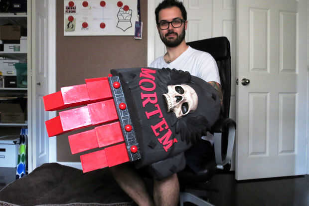Bueno por favor conmigo (jajaja) comenzó a agregar paneles de pal y decoración al cuerpo del puño de poder. Los adornos consisten en una calavera de halloween, cortan las alas de espuma, algunas letras del latín grimdark y unos remaches (también hechos de espuma).