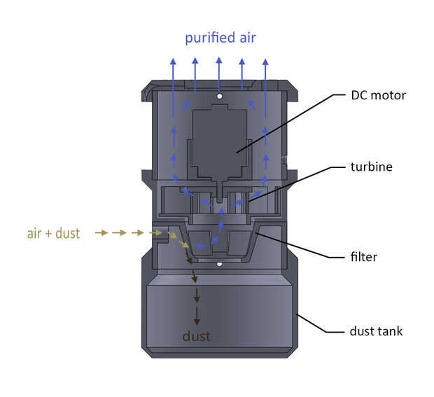 En el 3D impreso aspirador que he diseñado, el aire polvoriento va directamente al filtro que retiene el polvo mientras el ventilador aspira el aire limpio hacia la parte superior de la aspiradora y rechaza al aire libre.