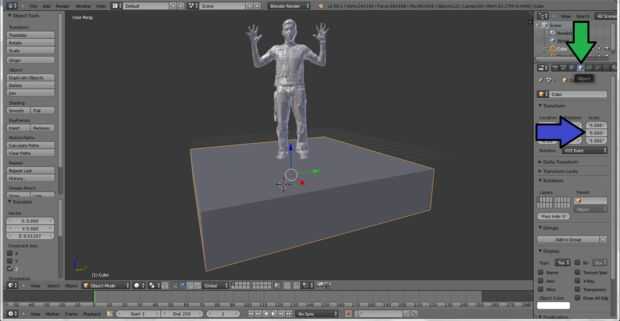 -Puede ampliar el tamaño de la malla de retiro te vas a la pestaña "Objeto" de la derecha de la pantalla (indicada por la flecha verde), y luego editar los números debajo de "escala" en la sección "Transformar" (indicada por la flecha azul) como se ve en la segunda imagen.