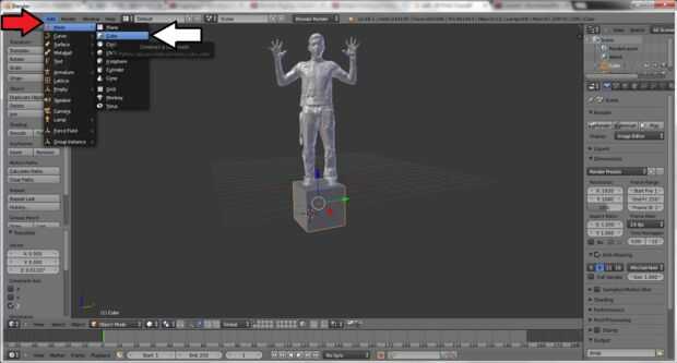 2. luego vaya a la pestaña "Añadir", desplácese hacia abajo hasta "malla" (ambos ubicados por la flecha roja) y una de las formas 3D se importar (indicado por la flecha blanca).