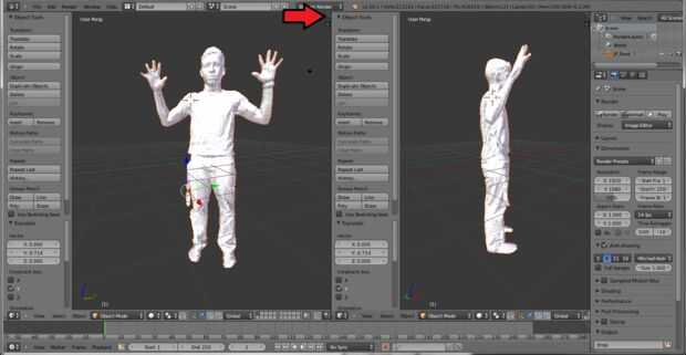 3. Haga clic en el conjunto donde desea colocar el primer hueso por lo que está marcado por el círculo rojo (en mi caso el hombro). Asegúrese de que está alineado en ambos puntos de vista, para que el hueso está en la malla.