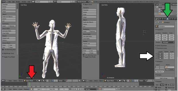 1. una vez que haya terminado de colocar los huesos en la malla, cambiar la pestaña indicada por la flecha roja al modo"objeto".