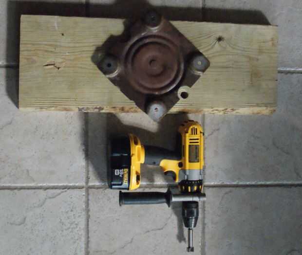 2. con el taladro y la broca de forester hacer un agujero en la base, en una de las secciones con muescas de la placa giratoria.