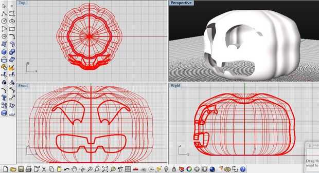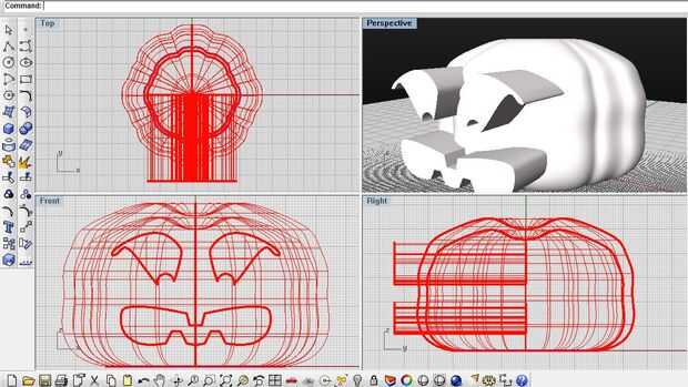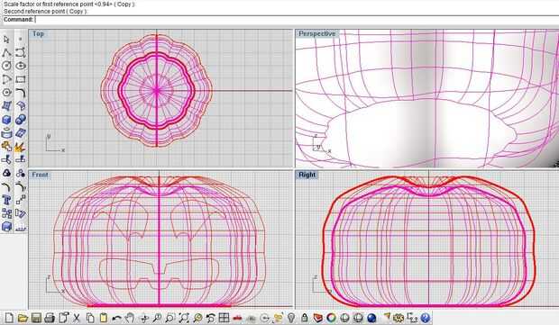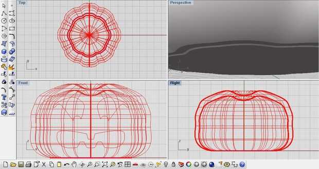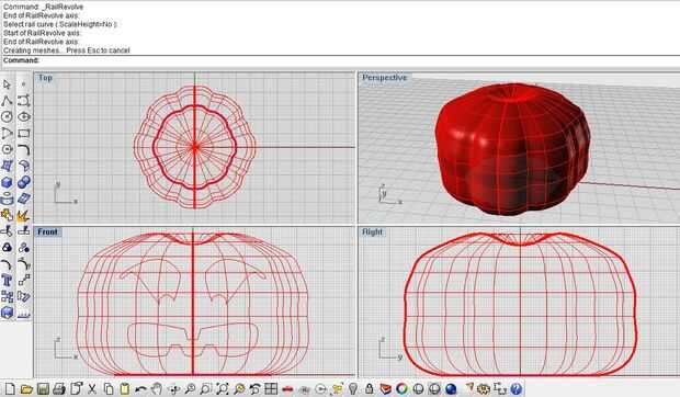 Uso el carril gira herramienta para ajustar la curva vertical alrededor de la forma de su círculo base. Utilice las herramientas de copia y escala para crear una forma calabaza más pequeña dentro de la primera. Tapa los orificios de la cepilladora de dos formas para crear sólidos. Asegúrese de que la forma de calabaza más pequeña sobresale por la parte inferior ligeramente. Luego utilice la herramienta de diferencia para eliminar la más pequeña forma para crear el vacío en la calabaza. Utilice la herramienta extrusión para hacer la cara sólidos curvas que sobresale a través de la cáscara.