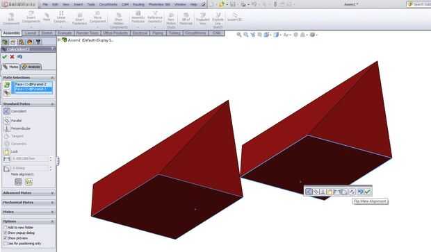 Paso 21 ahora comenzamos a palillo de pegamento las piezas juntas en SolidWorks. Primer lugar, seleccione el icono de "Mate" luego haga clic en ' n soltar sobre la superficie cuadrada de una parte, luego haga clic en ' n liberar en la otra plaza la superficie para "aparearse" estas superficies mutuamente... pero tienes que voltear el mate antes de hacer clic en ok debe utilizar el icono flip ver la imagen de Mate del tirón.