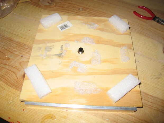 Pegamento caliente cuatro pequeñas tiras de la espuma en las esquinas en ángulo. Deben ser alrededor de 1/2 pulgada de espesor. Esto proporciona una amortiguación para cuando comprime la almohadilla. Pasar por alto los rastros de relleno que no están en las esquinas. Eran otras posiciones intenté pero no funcionó así.