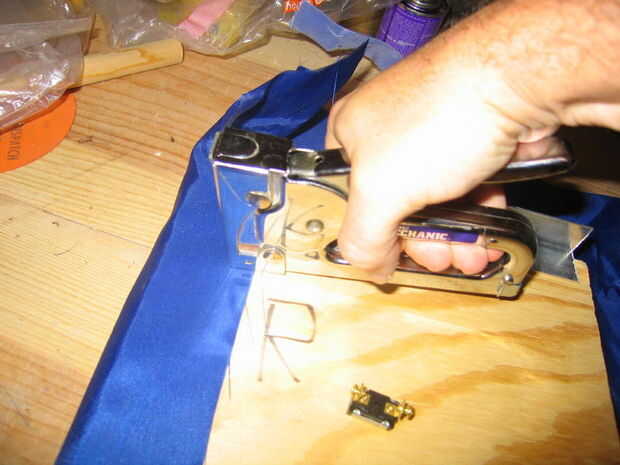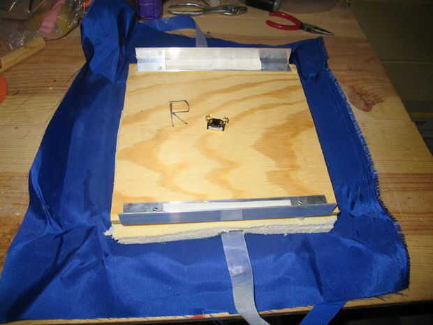 Grapa de nylon a la madera contrachapada. Deje suficiente espacio en la parte superior de las tiras de aluminio para el velcro a salir recto por lo que puede envolver alrededor de la barra de soporte.