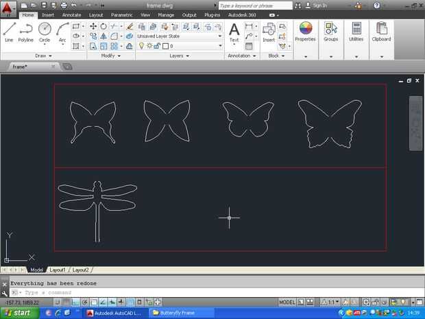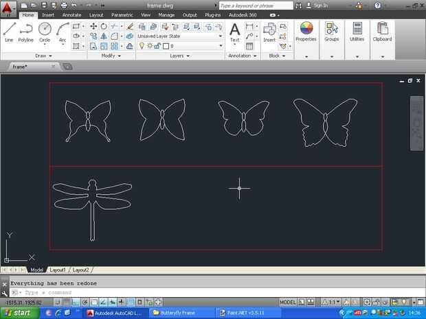 2. para la libélula, yo busqué en Google una imagen, luego inserta la imagen como fondo en Autocad. Yo entonces efectivamente trazada la mitad con una polilínea, reflejando una vez más para comprobar que era simétrica. Luego eliminar la imagen original.