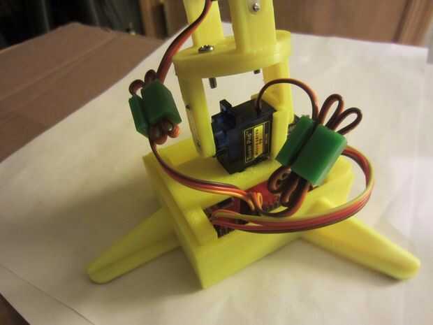Hemos añadido un par de toques finales al proyecto. Tuve unos 3/8" Pegar almohadillas antideslizantes que había en Home Depot. Les agregué a los pies para levantar un poco y darle un mejor agarre. También diseñé un encargado de cable de servo para poner en orden los cables de servo. Disponible en Thingiverse. Que tenga la escala hacia arriba o hacia abajo un poco para conseguir el ajuste correcto según tu impresora 3D.