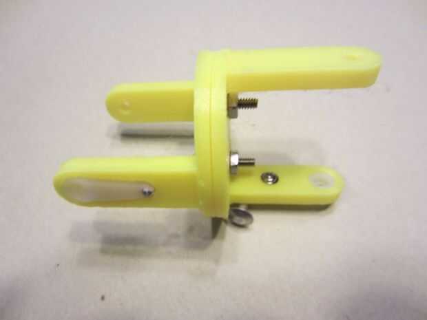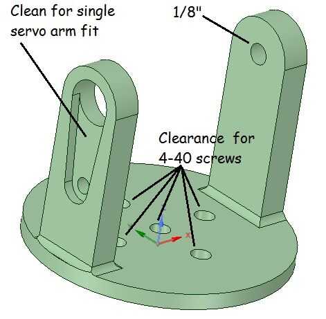 Para crear los movimientos para trabajar el laberinto estamos construyendo un montaje del cardán de 2 ejes controlado por los servos sg-90 2. Hay 4 piezas en el cardán - superior, inferior y 2 secciones de centro. Las secciones de centro tendrá que limpiarse a según el dibujo. Vamos a utilizar el brazo del servo de cara solo que viene con el servo. Coloque en la ranura y fije con uno de los tornillos más grandes que viene con el servo. La cabeza del tornillo será en el interior de la estructura vertical y con el punto de fijación a través de uno de los agujeros en el brazo. Después de apretar puede acortar el punto con cortadores laterales si los tienes. Repetir para la segunda parte del centro. Coloque las mitades de centro (con los montantes girados 90 grados) con (2) tornillos y tuercas 4-40.