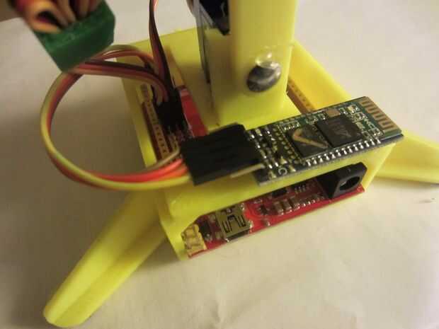 Hemos montado el módulo bluetooth HC-05 un poco de pegamento caliente como se muestra en la foto. Después el sketch completo es cargado .a la Junta utiliza 4 hilos del cable plano hembra para conectar las clavijas de datos seriales de RoboRed (ver foto arriba) a la HC-06 como sigue: