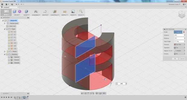 Al igual que última vez, queremos cortar el espacio negativo de la segunda carta. En la fusión, porque empecé el boceto en un plano de origen, tuve que recortar el dibujo en ambos lados. Tinkercad, convertí los dos prismas rectangulares que hice en los agujeros, y luego agrupan todos los objetos de tres.