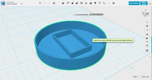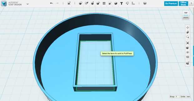 La caja aún tiene tres lados, por desgracia, alack! Prensa/tirar al rescate. Cambio la vista hasta que usted está buscando en la parte inferior del modelo, haga clic en modificar -> tirar de la prensa, a continuación, seleccione la cara de la caja que está empujando hacia fuera allí. Si has hecho las paredes de su hueco de caja de 1 mm, sólo necesita mover la flecha hacia arriba de 1mm al ras con la parte inferior del cilindro y quitar esa pared. Prueba jugando con prensa tire; es práctico y lo uso mucho para manipular formas. Es conveniente que puede quitar parte de un objeto simplemente moviendo un muro más allá de donde está la otra frontera.