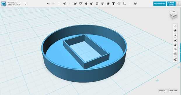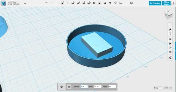 Para crear el soporte para la base de la bujía en el centro, hice un cuadro con las mediciones que tomé en el paso anterior (35 x 19.25 x 6.7 mm). Esta parte está situada en el centro del botón de Internet, que facilita las cosas. La forma más fácil es crear el cuadro en el centro del cilindro por pasar el ratón sobre hasta donde el cursor se ajusta al centro y entrar en las dimensiones allí. También puede crear en otro lugar y utilizar la herramienta de imán para ajustarla al centro de la superficie (y luego desagruparlas para hacerlo un objeto separado otra vez). Caí a la cama (prensa sería ') y el hueco hacia fuera de la misma manera el cilindro.