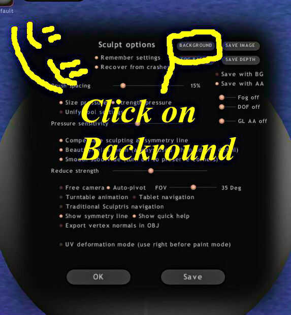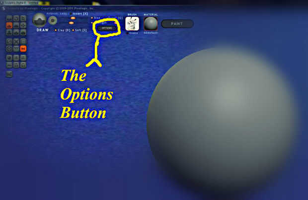 A continuación, abrir sculptris. Buscar algo sucedió! :) Ignorar los otros botones por ahora y haga clic en "opciones" (si usted no puede localizar mira mi foto) luego haga clic en "fondo". Encontrar la carpeta y seleccione la imagen! Usted debe verlo aparecer detrás de la esfera. No te preocupes si ahora se ve aplastado. Se escala el objeto más tarde. ¡ Felicidades! Tu en tu camino!