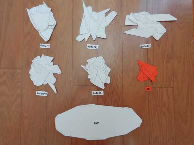 IMPORTANTE: A diferencia de mis otros modelos, este modelo no tiene montaje modular. Conjunto modular es el proceso de construcción de piezas individuales y luego poner las piezas juntas para crear la protección final (en el elefante, por ejemplo, los módulos son los troncos, orejas, colmillos y cabeza). En este modelo sin embargo, todo se construye continuamente. Comienza con el proyecto de ley y se prosigue hasta que todo se hace. Por lo tanto, las páginas en este modelo de pato se organizan de acuerdo con esto. Páginas se clasifican por su continuación a la página anterior. Por ejemplo, todas las piezas en la página 5 del cuerpo están conectadas a las piezas en la página del proyecto de ley. Una vez que cortes una página, asegúrese de que usted recortar la etiqueta del nombre de la página. Mantener juntas todas las piezas en una página. Esto acelera el proceso de montaje, porque reduce la cantidad de tiempo empleado en encontrar una pieza coincidente para una arista o una aleta. Durante el montaje, el orden es el siguiente: proyecto de ley--> cuerpo (5)--> cuerpo (4)--> cuerpo (3)--> cuerpo (2)--> cuerpo (1)--> Base. Los pasos en este Instructable siguen este patrón.