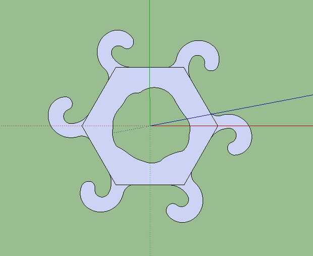 Como mi primer diseño en impresión 3D, he trabajado en SketchUp, que es un programa gratuito que es un gran punto de partida. Mi objetivo era crear una forma modular que puede ser replicada e interconexión. Yo estaba pensando en vértebras y vino para arriba con una forma hexagonal con patas que se enclavija, algo inspiradas por barril de monos. Comenzó con un hexágono, agrega formas curvas en cada esquina y modifica las líneas para darle una sensación más orgánica.