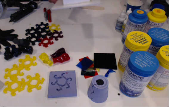 Para hacer múltiplos, el molde se llenó de SmoothCast325, que es dyeable. Como el caucho, esto viene en dos partes que se mezclan para iniciar una reacción química. Puede añadirse colorante para agregar color a la resina. Una vez que la resina está lista, se vierte en el molde de caucho. La resina del molde puede estallar hacia fuera mientras que se encuentra parcialmente (todavía maleable) y permitió establecer completamente fuera del molde mientras que se lanza una nueva forma.