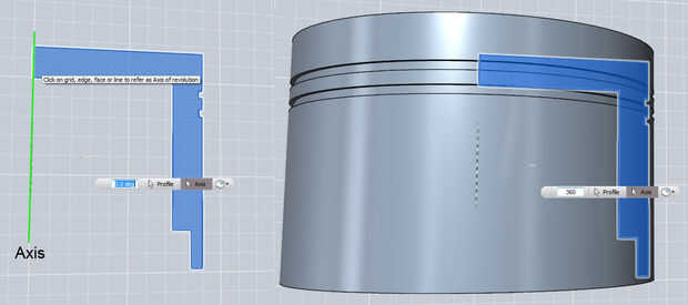 Utilice la herramienta de revolución encuentra bajo el menú de construcción y haga clic en el dibujo. Hacer shure que haga clic en eje no en el perfil y seleccione el eje que marca verde. Escriba en 360° y pulse Entrar.