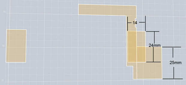 Ocultar el sólido y hacer un rectángulo de 25mm alto (esto es sólo para facilitar su manejo). Añadir otro rectángulo con las medidas de 14 x 24 mm y lugar como lo hice. Quitar la primera ractangle. Seleccione el rectángulo restante copiarlo y pegarlo. Entonces moverla 90 mm a la izquierda.