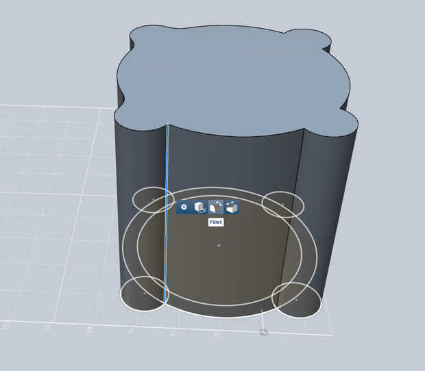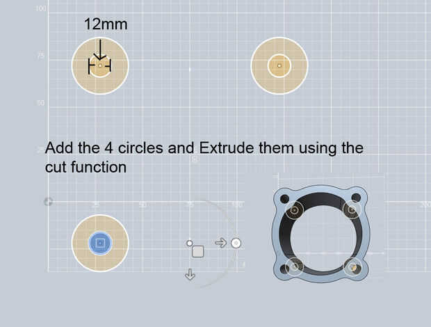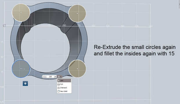 Saca el gran círculo de 130 mm. extrusión del círculo interior y utilice la opción cortar. Luego se sacan los 4 círculos pequeños (join). Seleccionar las líneas donde los pequeños tubos cortan grande y seleccionan. Haga clic en filete y escriba en 15 para cada una de esas líneas.