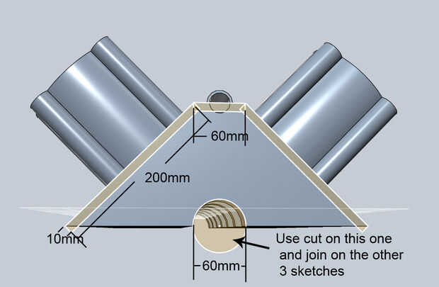 Añadir los bocetos a la sólida primera y sacamos los 3 rectángulos de 625 mm (join) y el círculo de 625mm tambien (pero corte!). Utilice los cilindros donde los pistones se colocan en rotación de 45° y colocar en un lado del sólido nuevo. Luego copiarlo, gire 90 ° la otra forma y colocarlo en el otro lado.