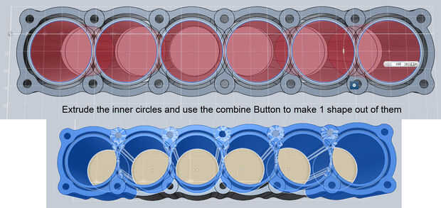 Copia el círculo de 90mm 6 veces demasiado y extruyelo (corte). Haga clic en el menú combinar y seleccione todos los sólidos que están en la pantalla.