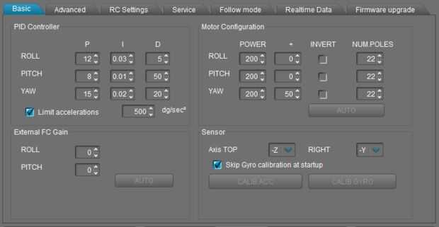 Nos referimos a nuestro sitio web en OpenSAM.net para una descripción de la configuración que hemos utilizado para nuestro sistema de SimpleBGC AlexMos. Ver capturas de pantalla aquí si quieres una idea rápida.