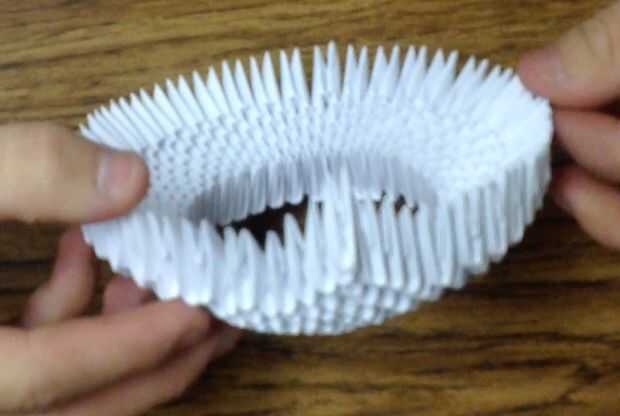 Directamente enfrente de la cola, cuello y cabeza: Iniciar mediante la adición de cinco módulos y luego añadir cuatro en ese entonces al respecto que, luego con dos, uno, luego dos punto de la pirámide cubriendo la mitad del módulo superior y el punto siguiente para y a continuación añadir luego agregar uno de, mantener añadiendo módulos y curvar el cuello hacia atrás hasta el borde superior de las piezas se convierten en horizontal a la superficie está en. Luego voltear las piezas al revés, añadir dos, luego uno luego dos luego uno nuevo hasta el cuello vuelve a la curvatura deseada. (Segundo y terceros vídeos)