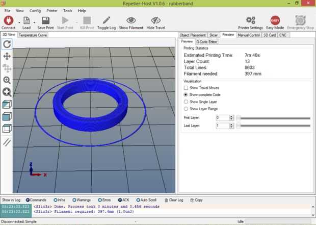 Imprimir su diseño. Como estamos usando Ninjaflex, sugiero usar velocidades lentas para evitar problemas de extrusión. Puesto que es tan pequeño y simple, la impresión debe tomar mucho. Estos son los ajustes que imprimí con:
